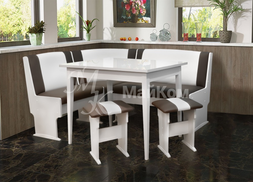 110 В комплект кухонного уголка “Фаворит” входят: угловой диван, обеденный стол (раздвижной или нераздвижной) и 2 табурета.